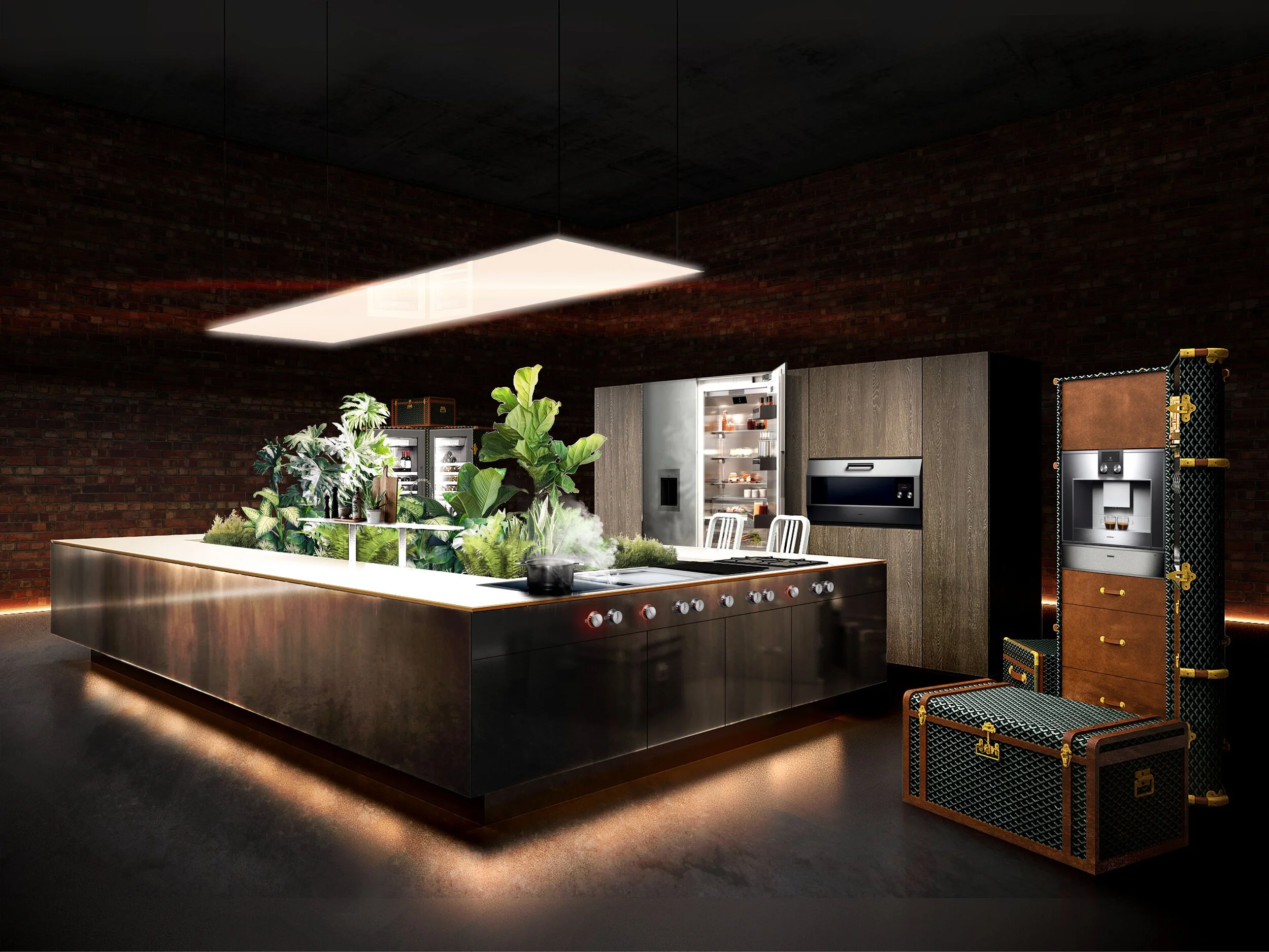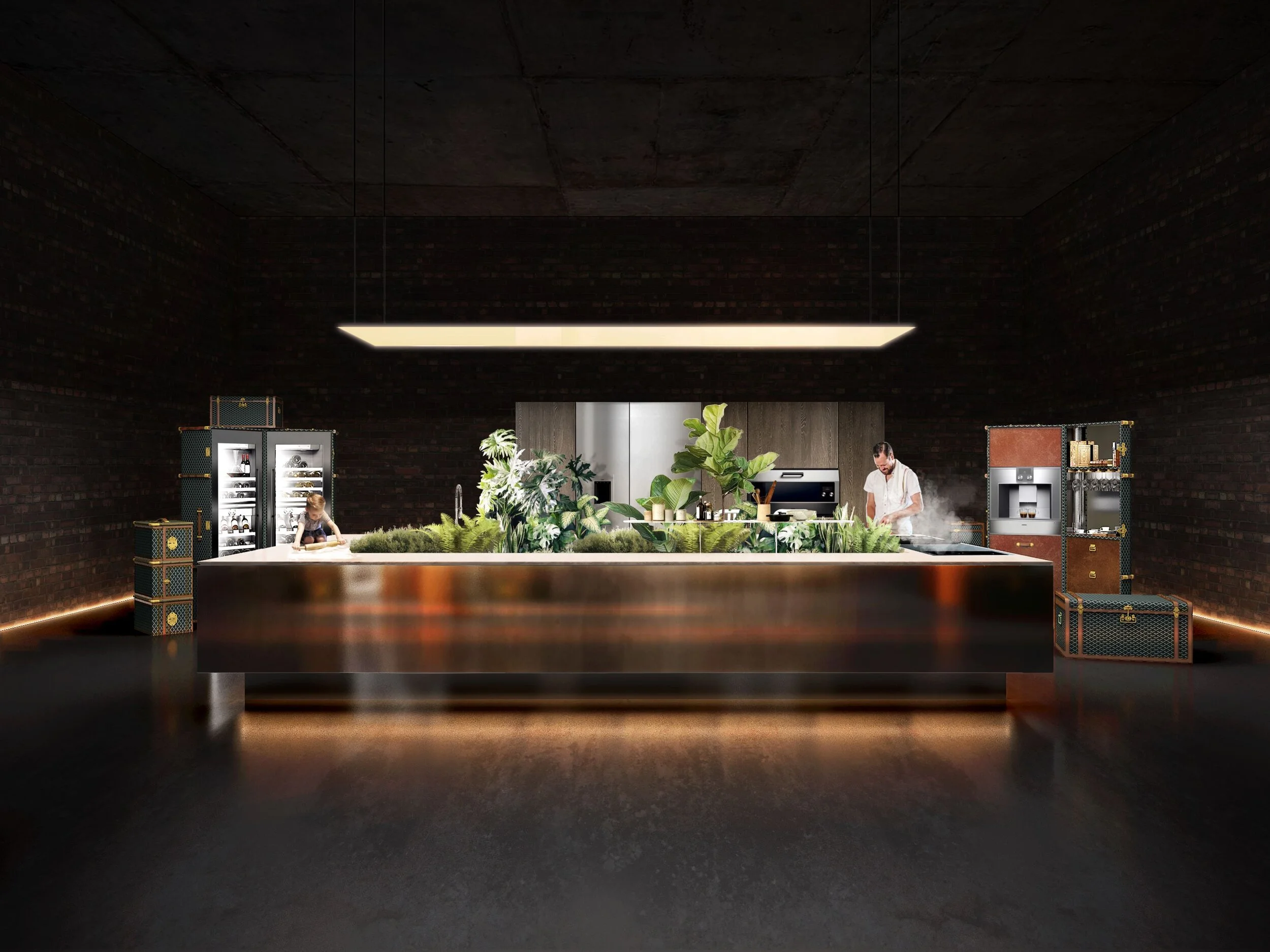 Verdant foliage is integrated into the architecture of the kitchen, forming a living backdrop that turns the space into a visual centrepiece rather than a purely functional zone. The concept balances the precision of Gaggenau’s engineering with Sujonohun’s spatial sensibility, creating a kitchen that feels immersive, crafted, and quietly expressive.