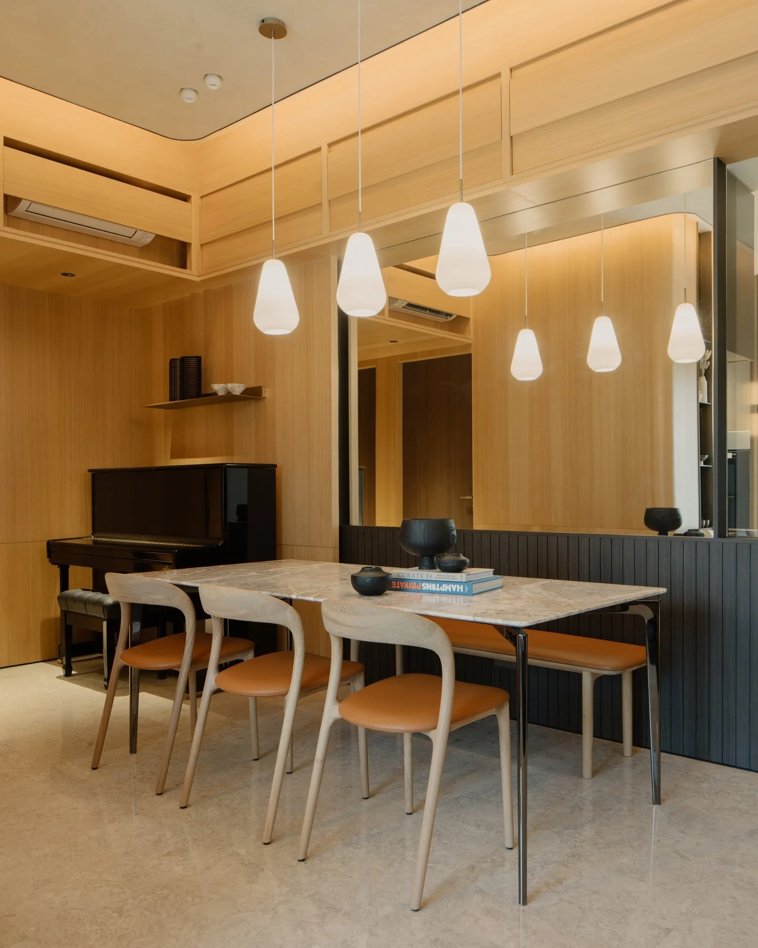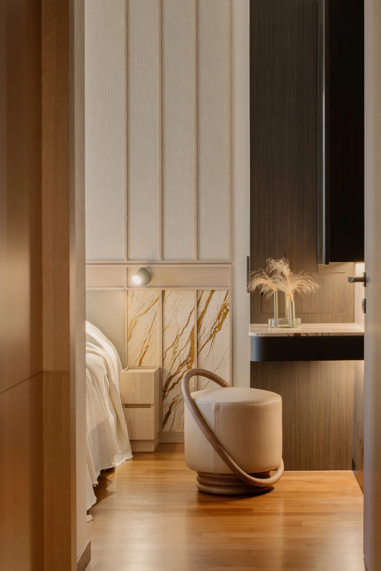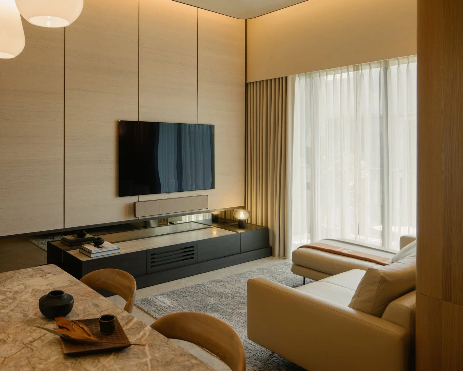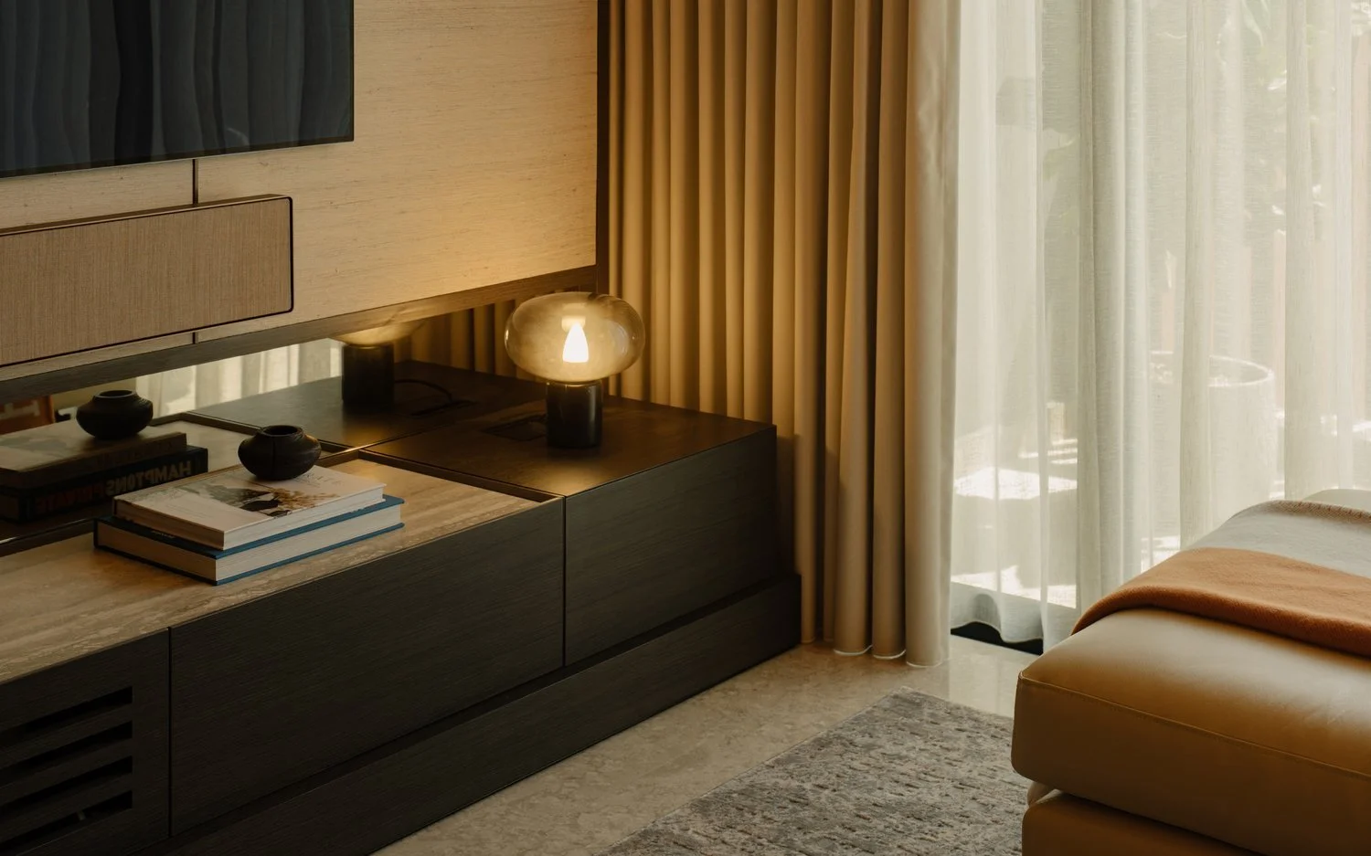 The interior takes cues from vernacular resorts in Bali, translated through natural textures and a softened palette. The design establishes contrast with the new build while complementing its architecture — a dialogue between crafted warmth and contemporary form.