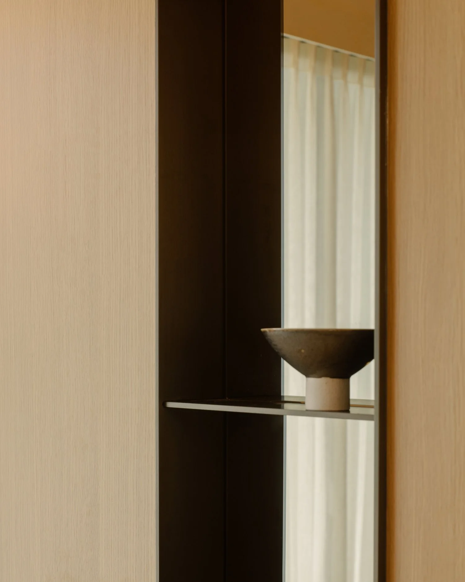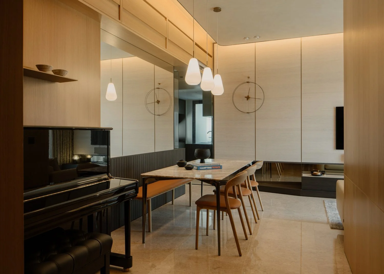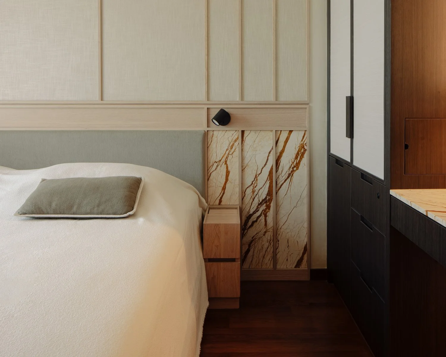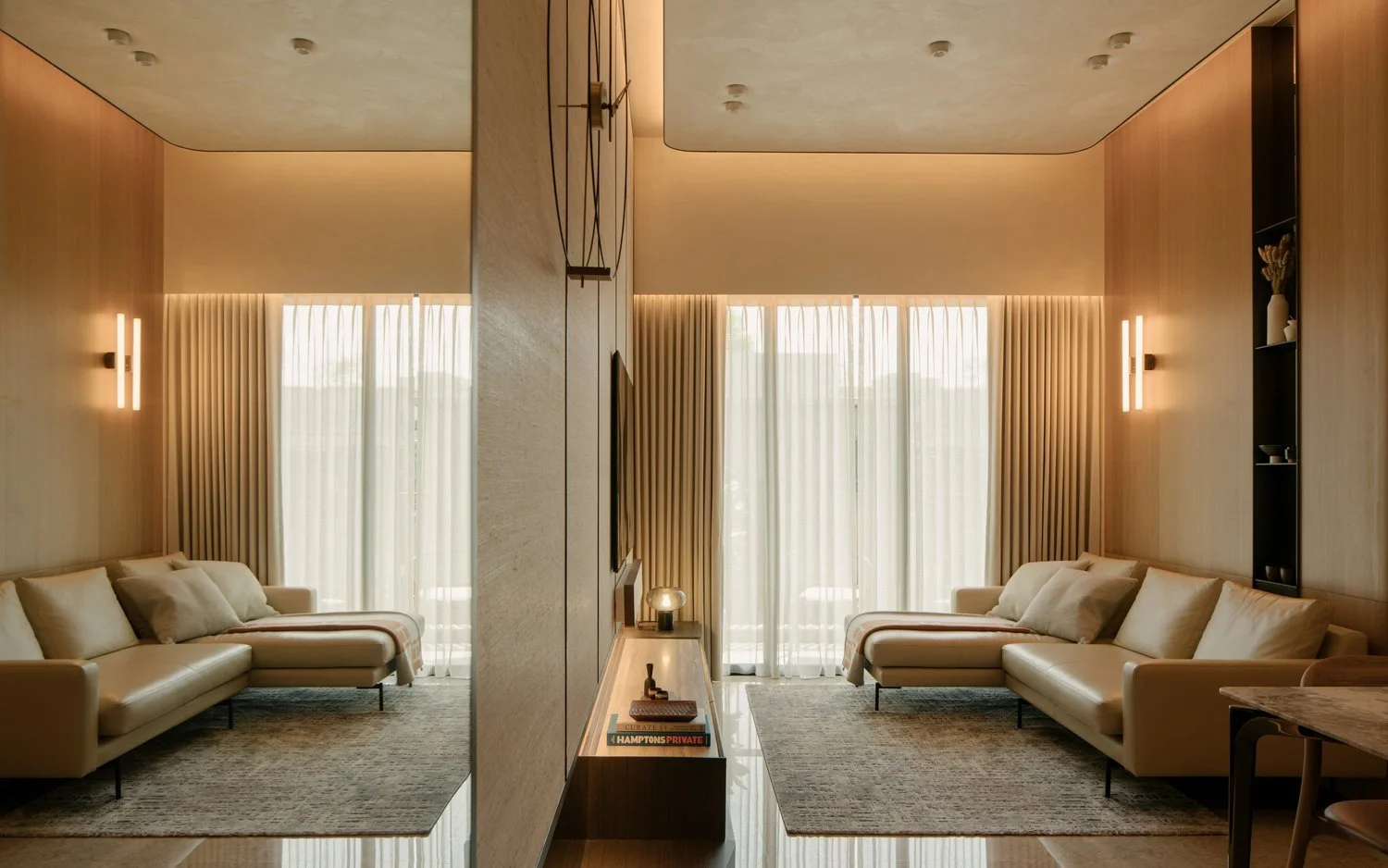 The interior takes cues from vernacular resorts in Bali, translated through natural textures and a softened palette. The design establishes contrast with the new build while complementing its architecture — a dialogue between crafted warmth and contemporary form.
