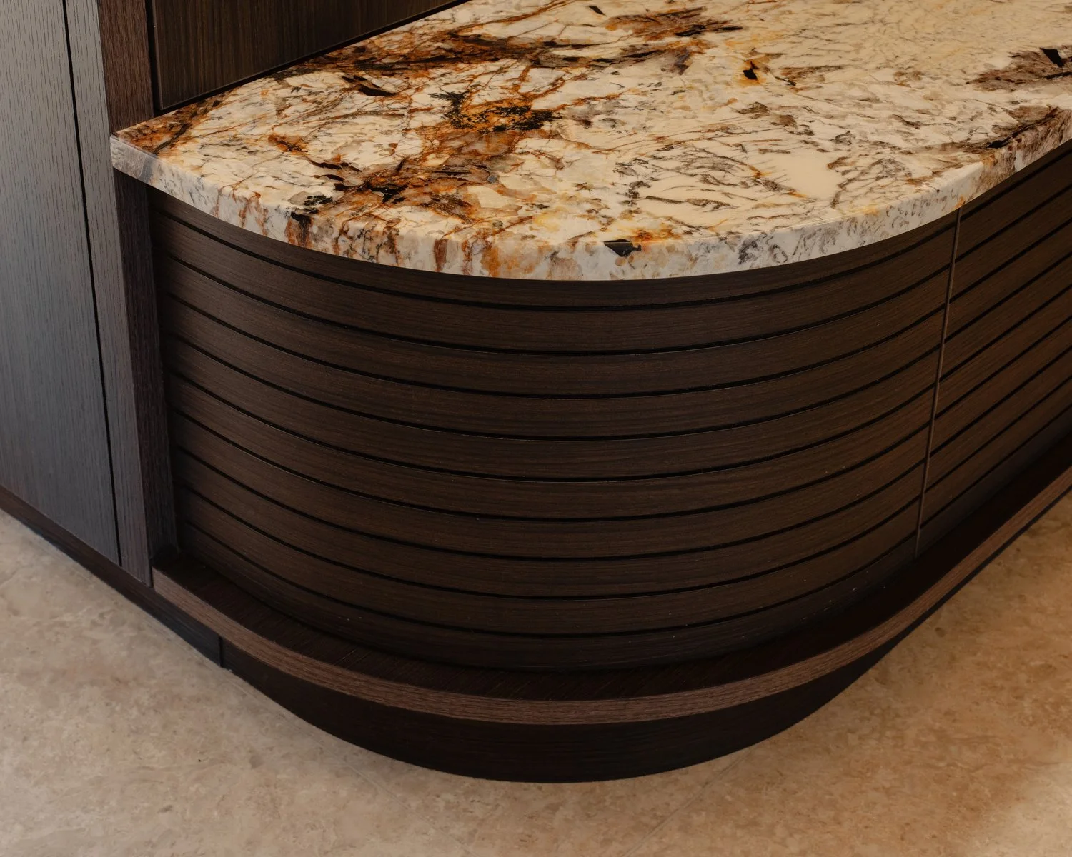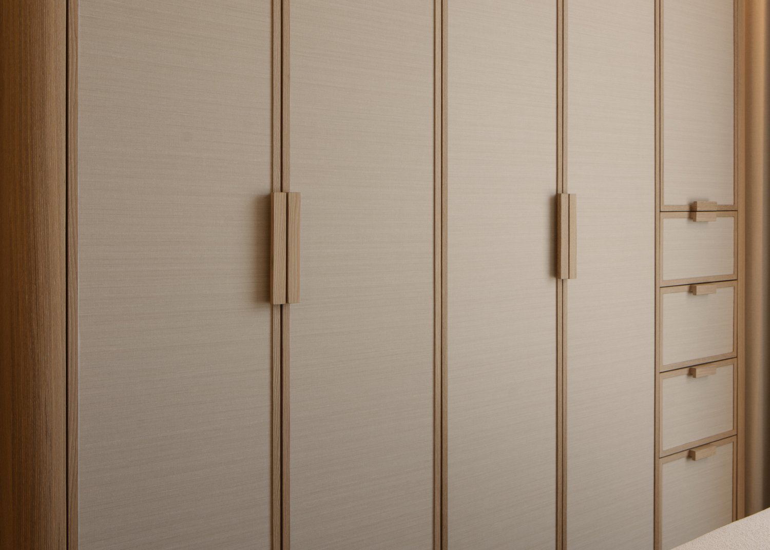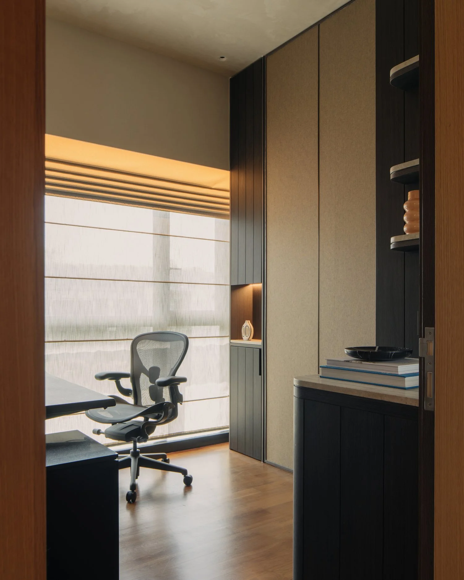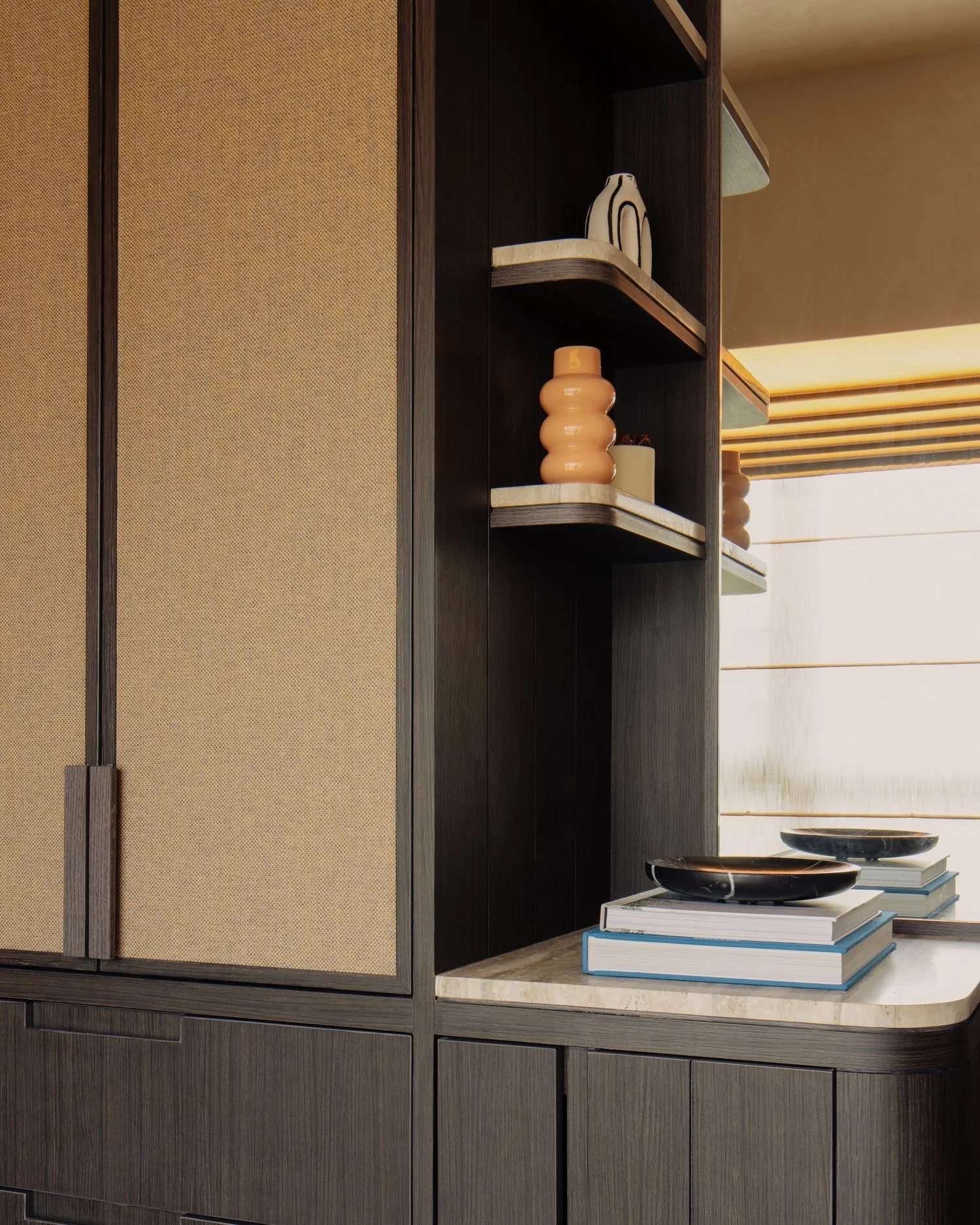 The interior takes cues from vernacular resorts in Bali, translated through natural textures and a softened palette. The design establishes contrast with the new build while complementing its architecture — a dialogue between crafted warmth and contemporary form.