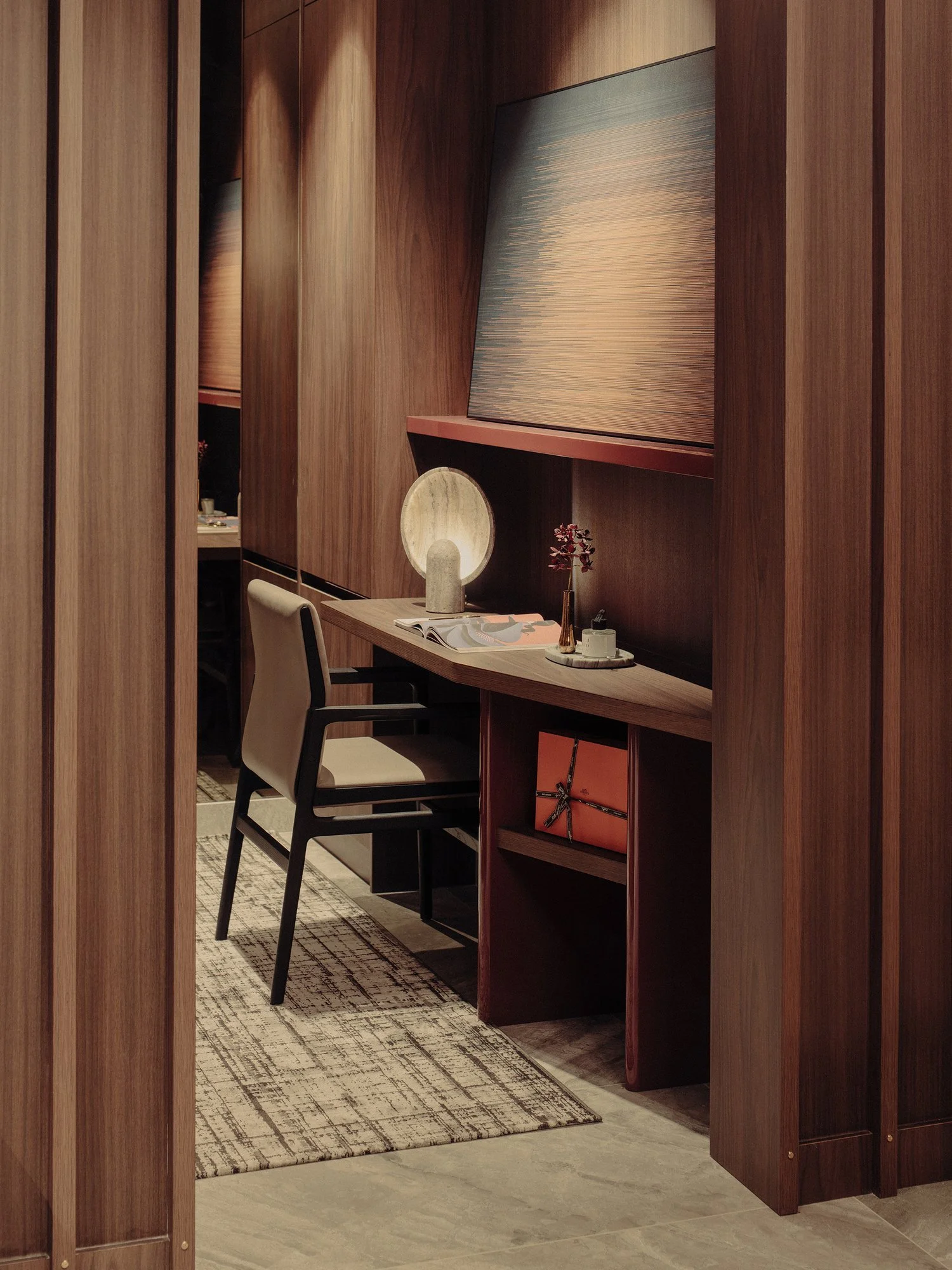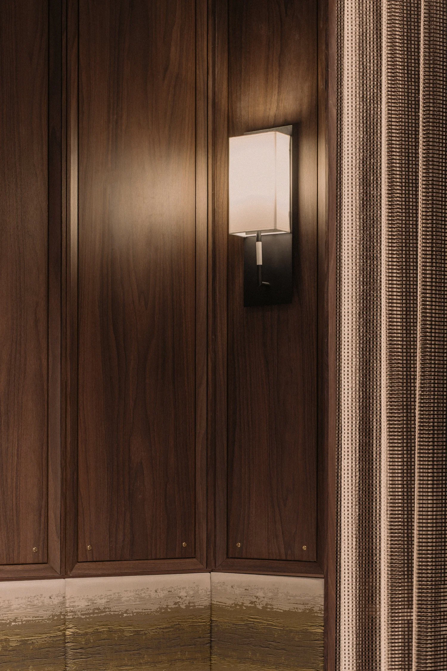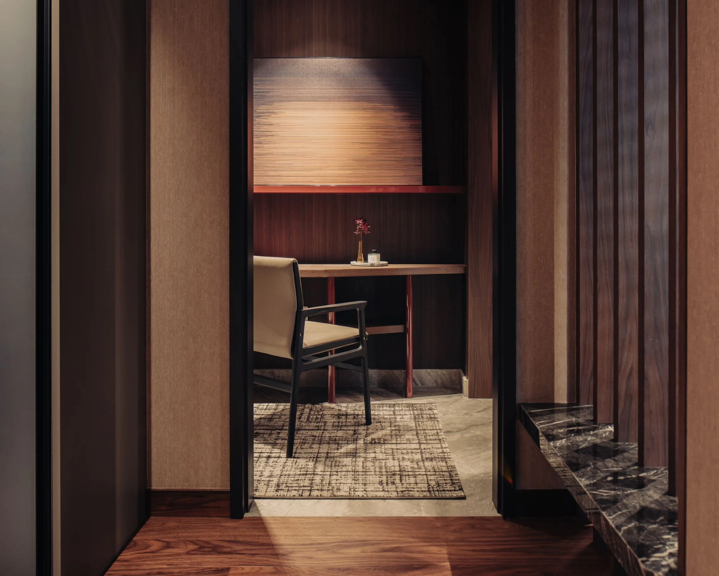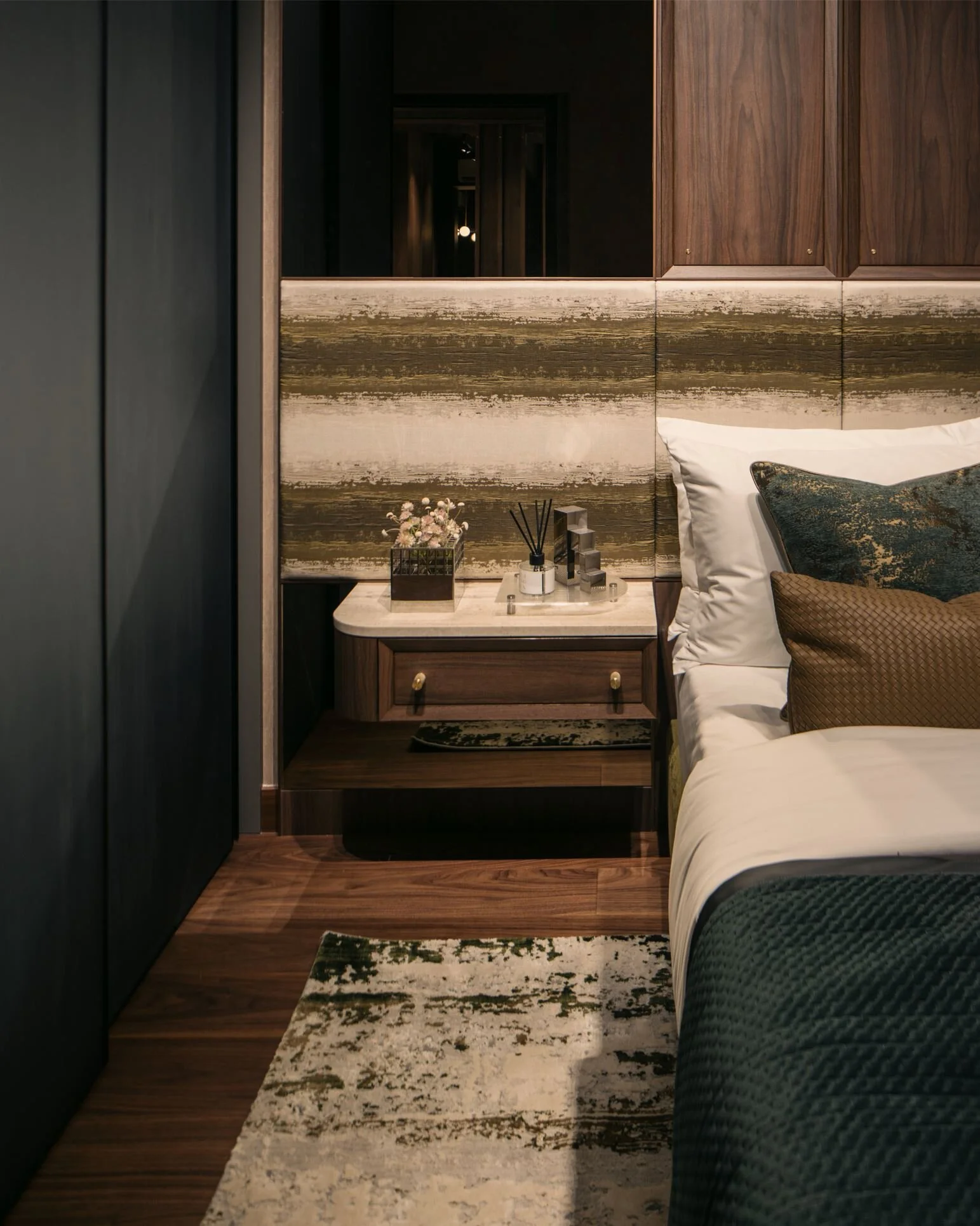 The suite is framed around a darker, more absorptive palette, allowing light to fall in measured layers rather than broad strokes. Metal stud detailing anchor the carpentry, giving the built-ins a finer edge and a sense of structural intention.