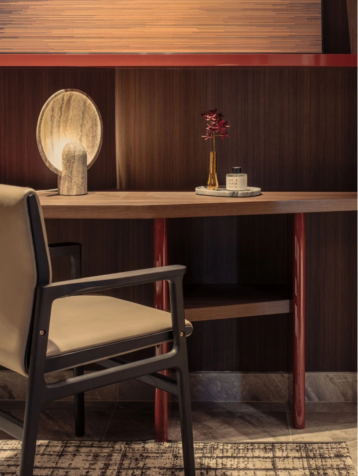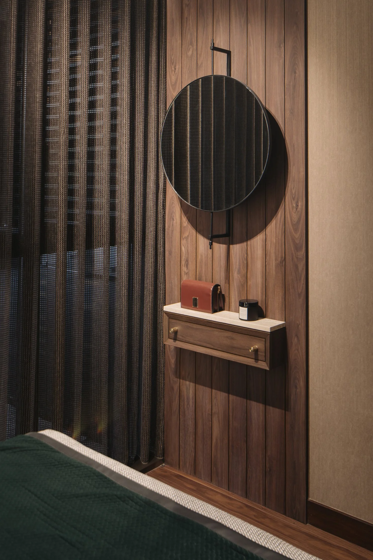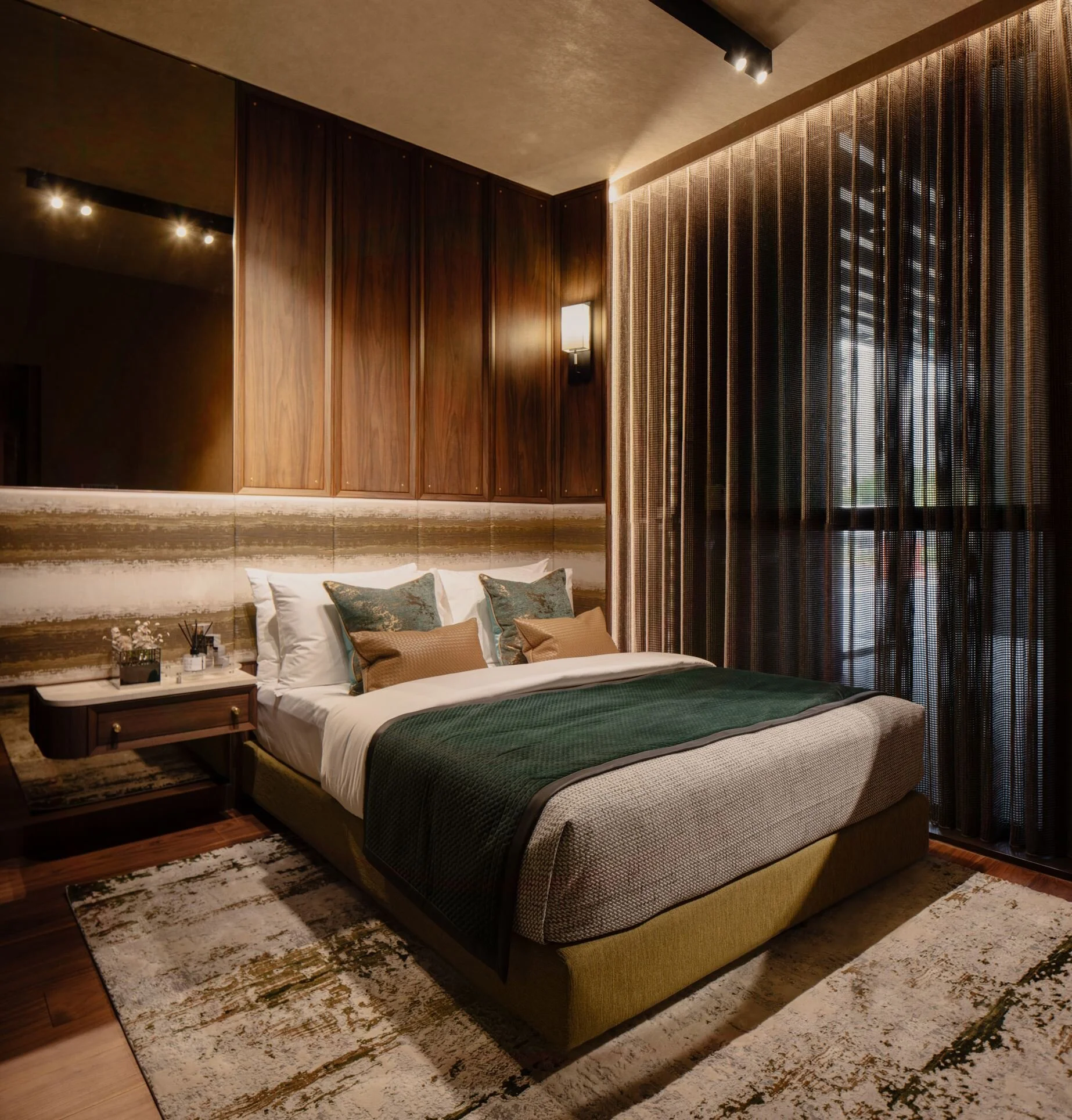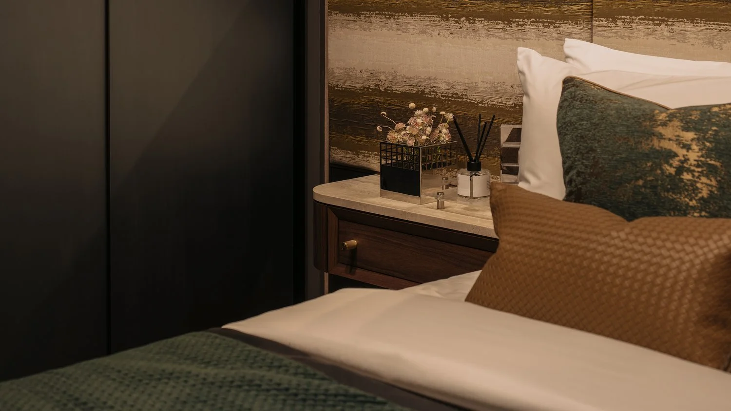 The suite is framed around a darker, more absorptive palette, allowing light to fall in measured layers rather than broad strokes. Metal stud detailing anchor the carpentry, giving the built-ins a finer edge and a sense of structural intention.