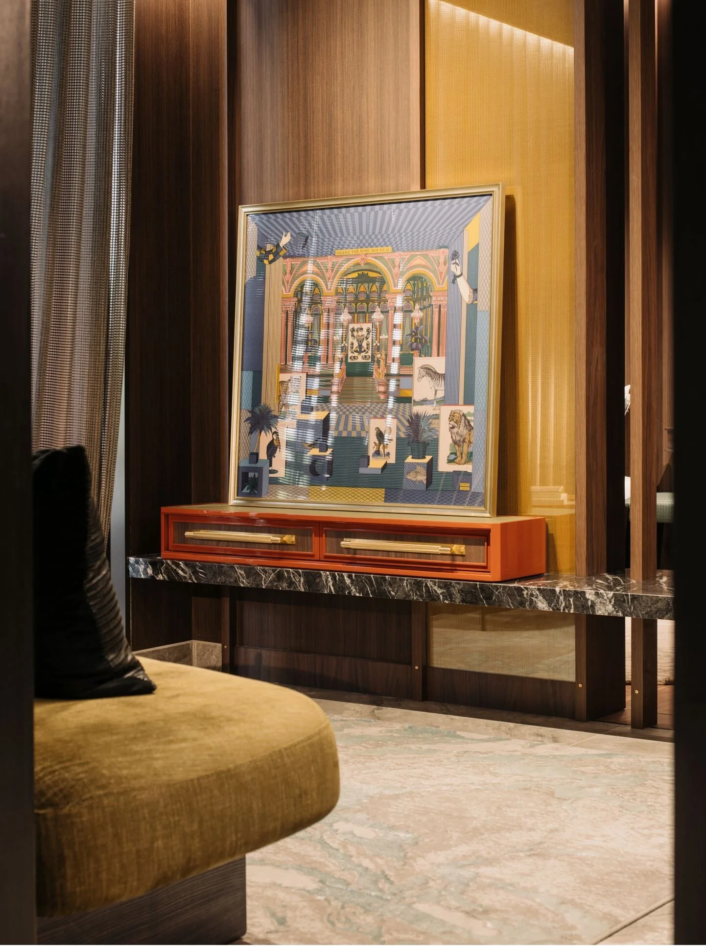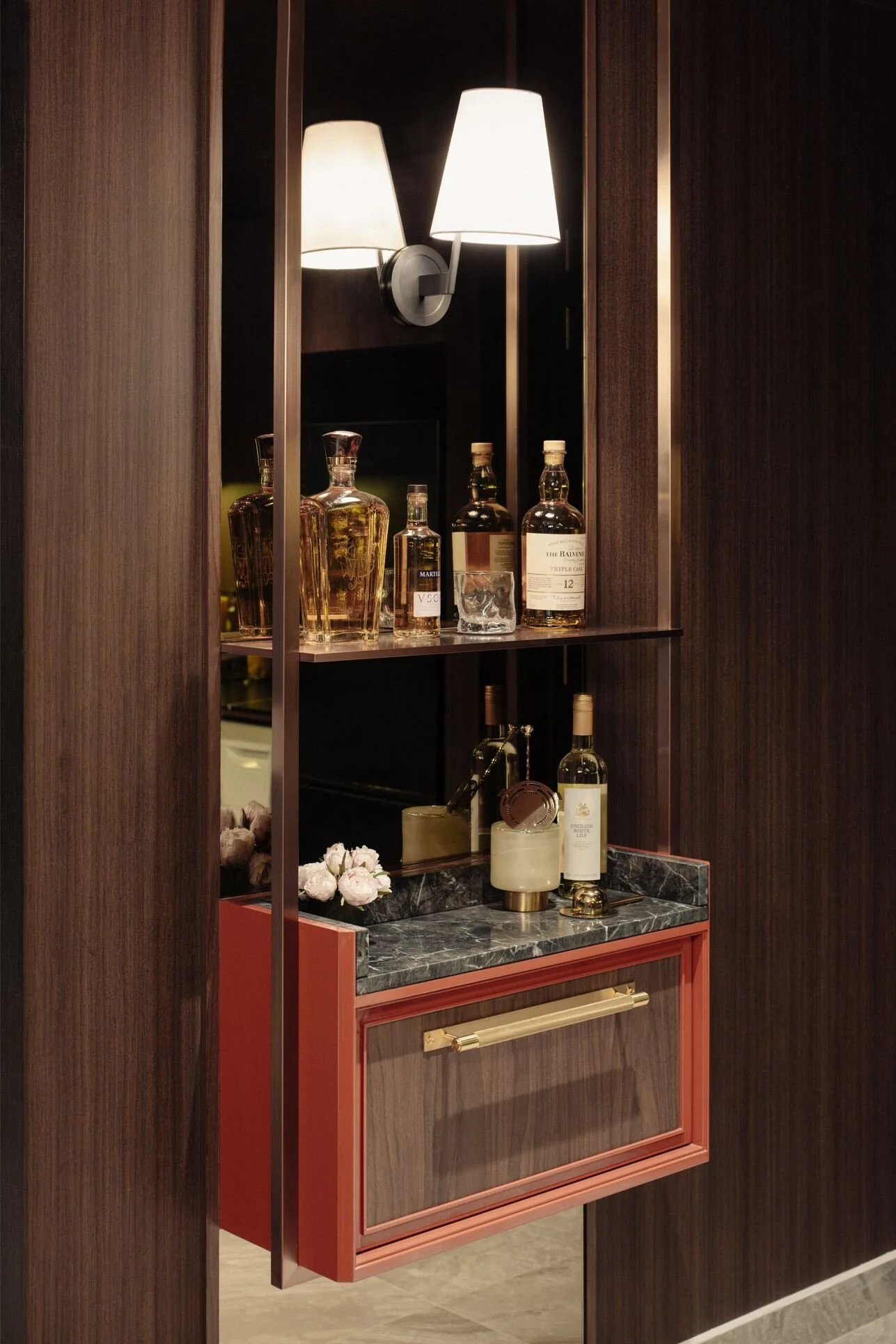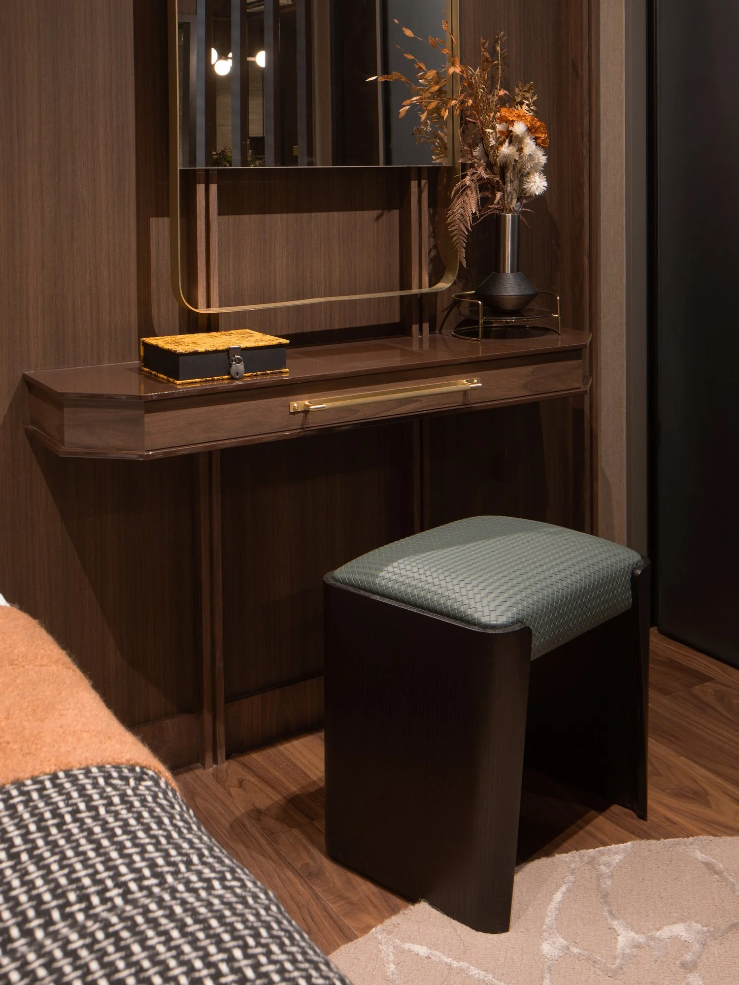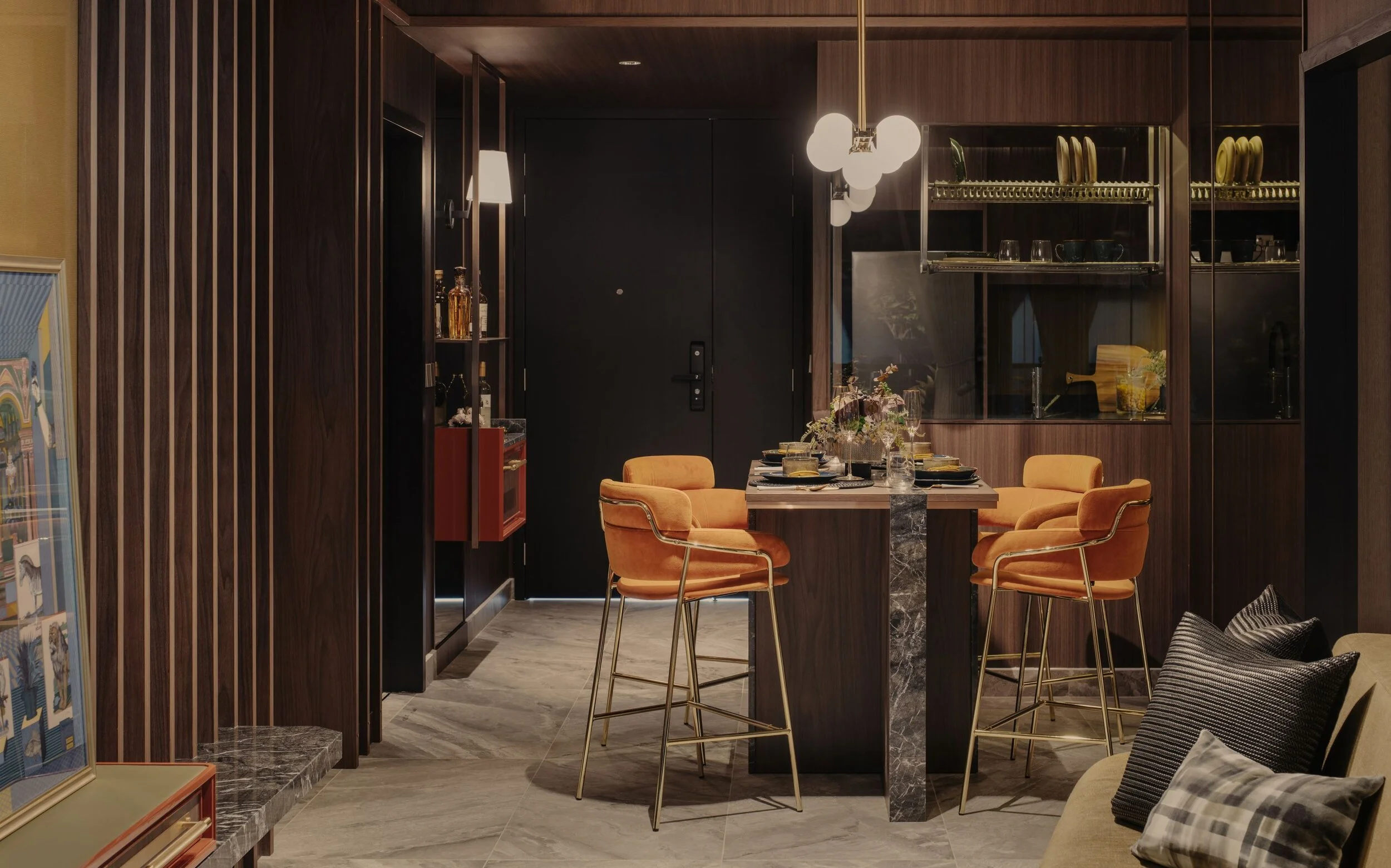 The suite is framed around a darker, more absorptive palette, allowing light to fall in measured layers rather than broad strokes. Metal stud detailing anchor the carpentry, giving the built-ins a finer edge and a sense of structural intention.