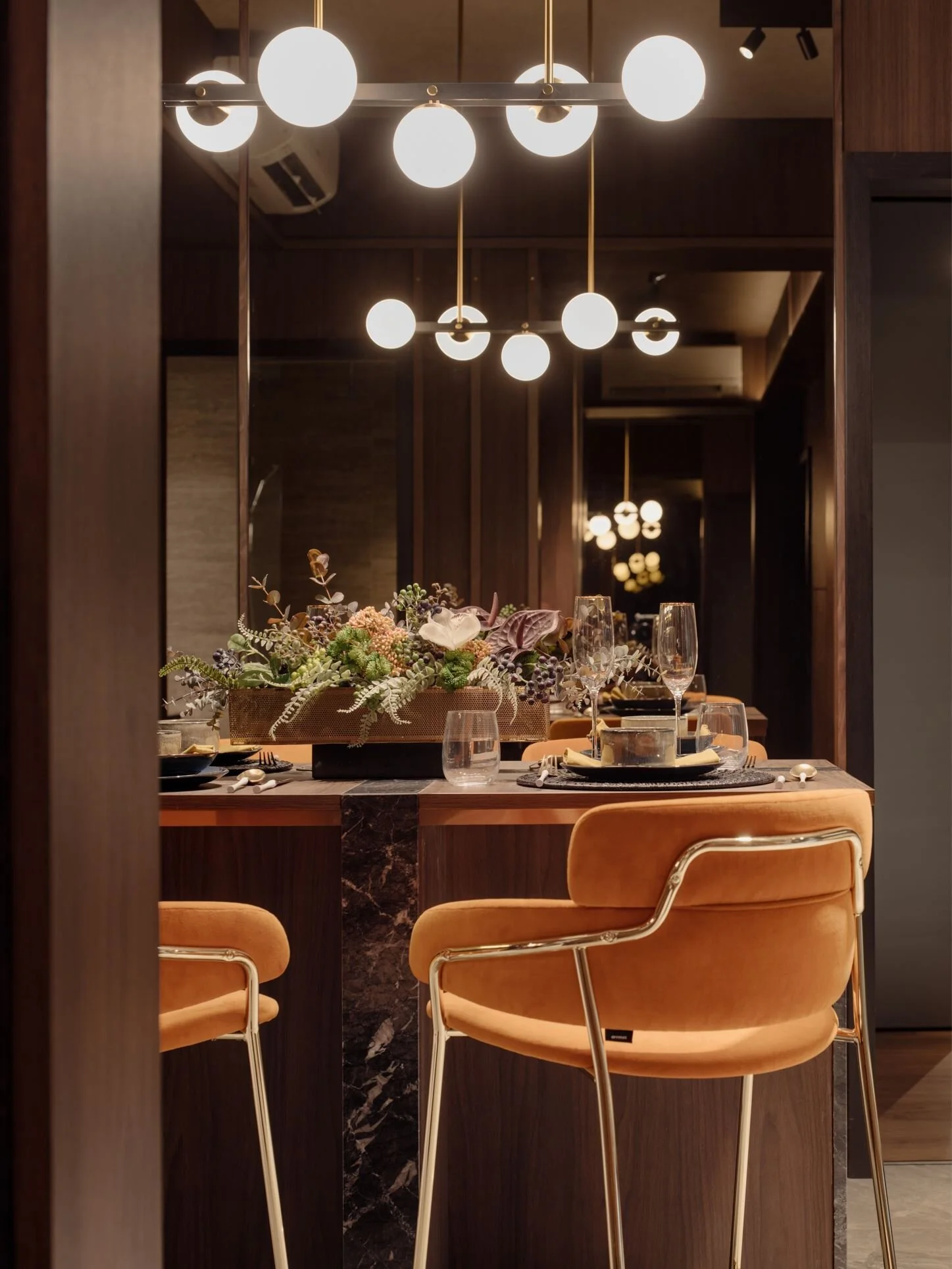 Colour is introduced sparingly — not as decoration, but as counterpoint — to soften the density of the materials and temper the room’s overall weight. The result is a compact interior that reads quietly, with enough tonal depth to feel lived-in yet composed.